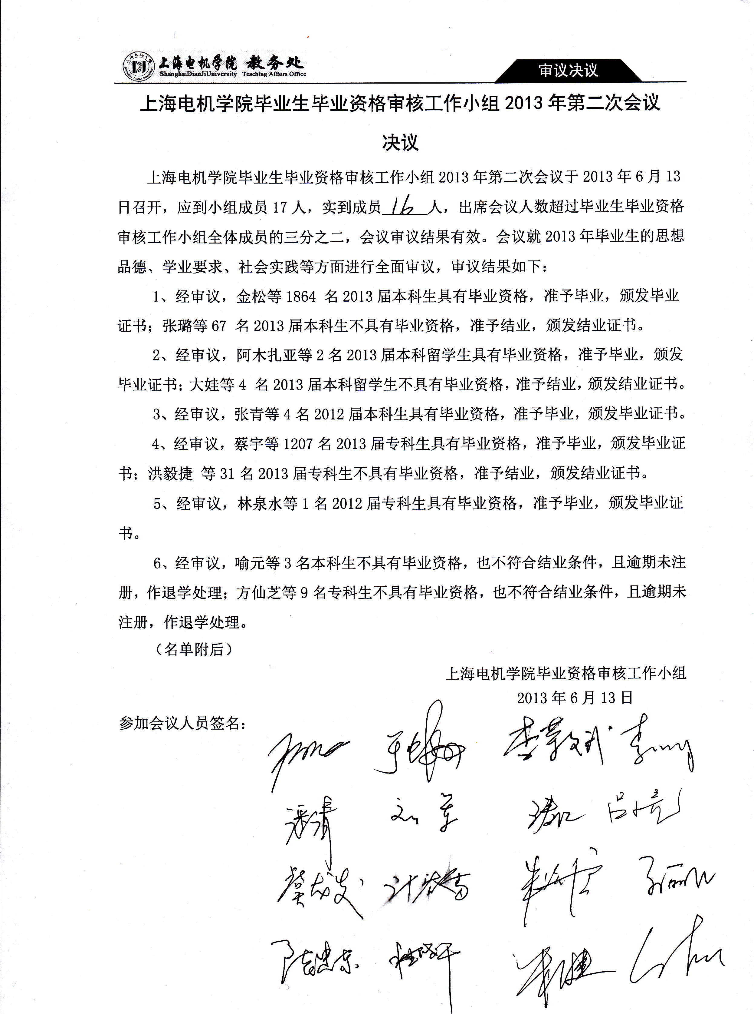 上海电机学院毕业生资格审核工作小组2013年第二次会议决议