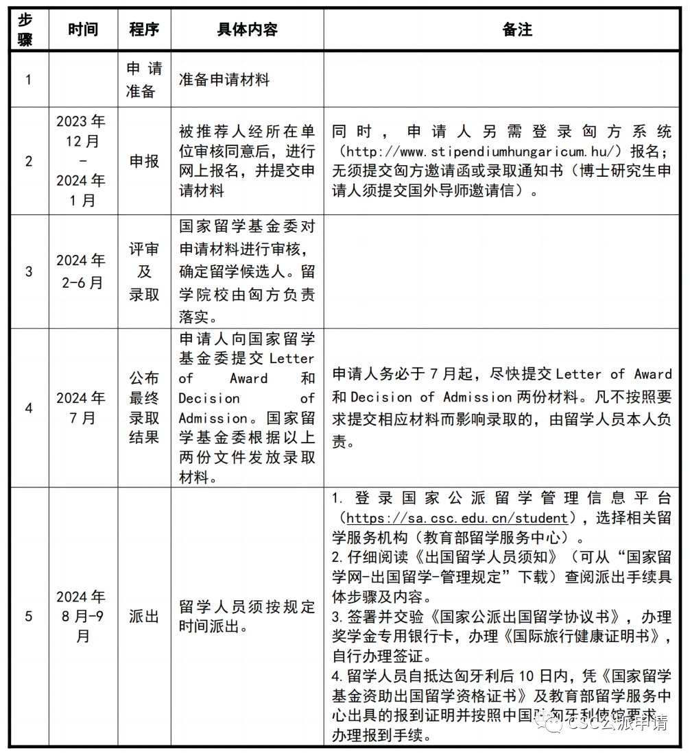 (2)2024/2025年度匈牙利互换奖学金网上申报时间为2023年12月15日-2024年1月5日,申请人须登录“国家公派留学管理信息平台”进行网上报名并按要求上传申请材料(https://sa.csc.edu.cn/student)。