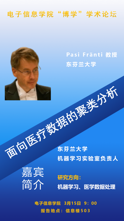 东芬兰大学机器学习实验室负责人 Pasi Franti 教授, 东芬兰大学终身教授。 发表了 112 篇国际期刊论文,179 篇国际会议论文及 63 篇科技论文,指导 31 名博士毕业,多个国际期刊的编委和国际会议的主席,比如《AIMS Applied Computing and Intelligence》、《Pattern Recognition Letters》,IEEE 高级会员。主持和参与多项国家、国际科研项目,包括 IMPRO 和 MOPSI 项目。