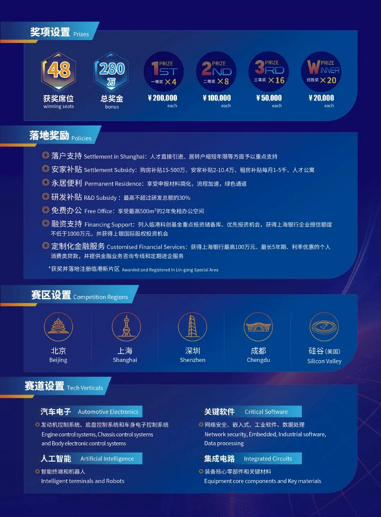 大赛共设 48 个获奖席位,280 万元总奖金,并为获奖项目提供人才落户支持、安家补贴、永居便利、研发补贴、免费办公、融资支持、定制化金融服务等落地奖励。