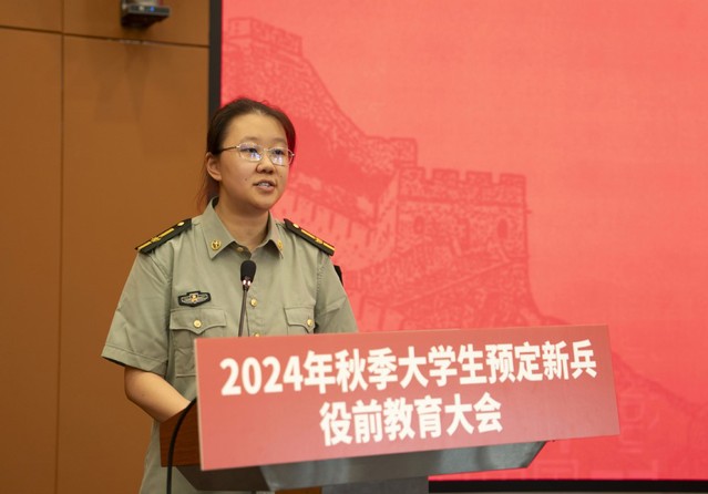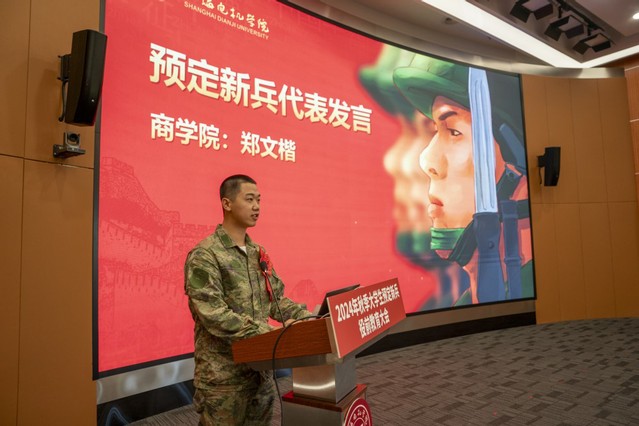 商学院党员同学郑文楷代表预定新兵发言,表达了参军入伍的决心和信心。郑文楷同学的发言充满了对未来的憧憬和对责任的深刻理解,展现了新时代大学生的使命感和责任感。