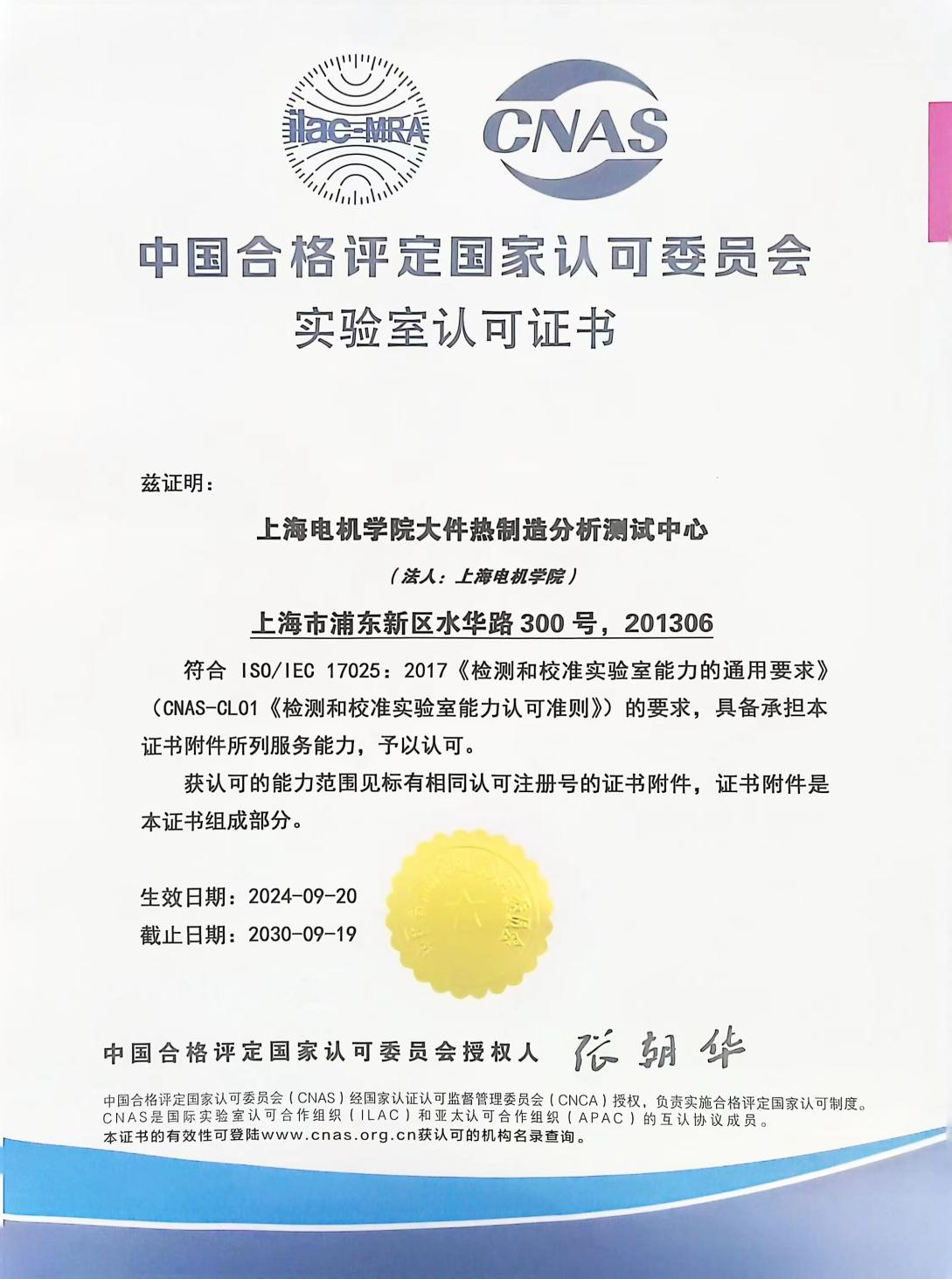 近日,我校材料学院牵头申请的上海电机学院大件热制造分析测试中心顺利通过了中国合格评定国家认可委员会资质评审及合格评定,成功获得国家认可实验室CNAS资质证书。CNAS证书的获得标志着我校的分析测试中心符合国际标准的质量管理体系、软硬件设备设施、管理水平和检测技术能力,具备提供更为合规、精准及具有国际权威性和公信力的检测服务。