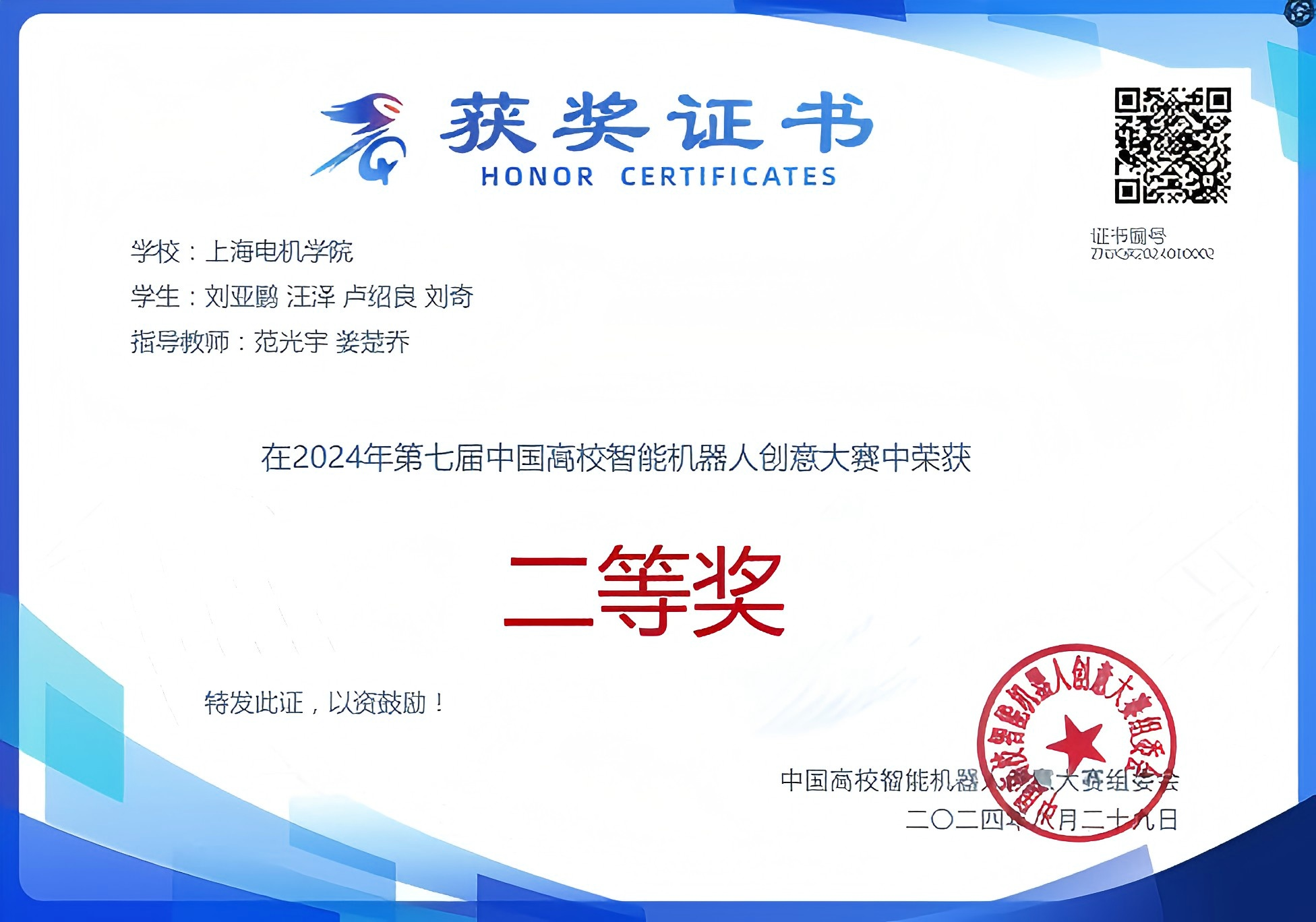 2024年8月21日-22日,中国高校智能机器人创意大赛总决赛在浙江宁波余姚开赛。大赛决赛由中国高校智能机器人创意大赛组委会主办,余姚市人民政府、浙江大学机器人研究院承办,比赛分为创意类、竞技类、格斗类,包括俄罗斯方块机器人、四足机器人、VEX-U智能机器人、人形机器人等赛项。在比赛现场,来自27个省(自治区、直辖市)382所高校的1366支参赛队共4192名参赛选手展开了精彩角逐。我校师生积极准备,最终在四足机器人赛项取得了总决赛二等奖的优异成绩。