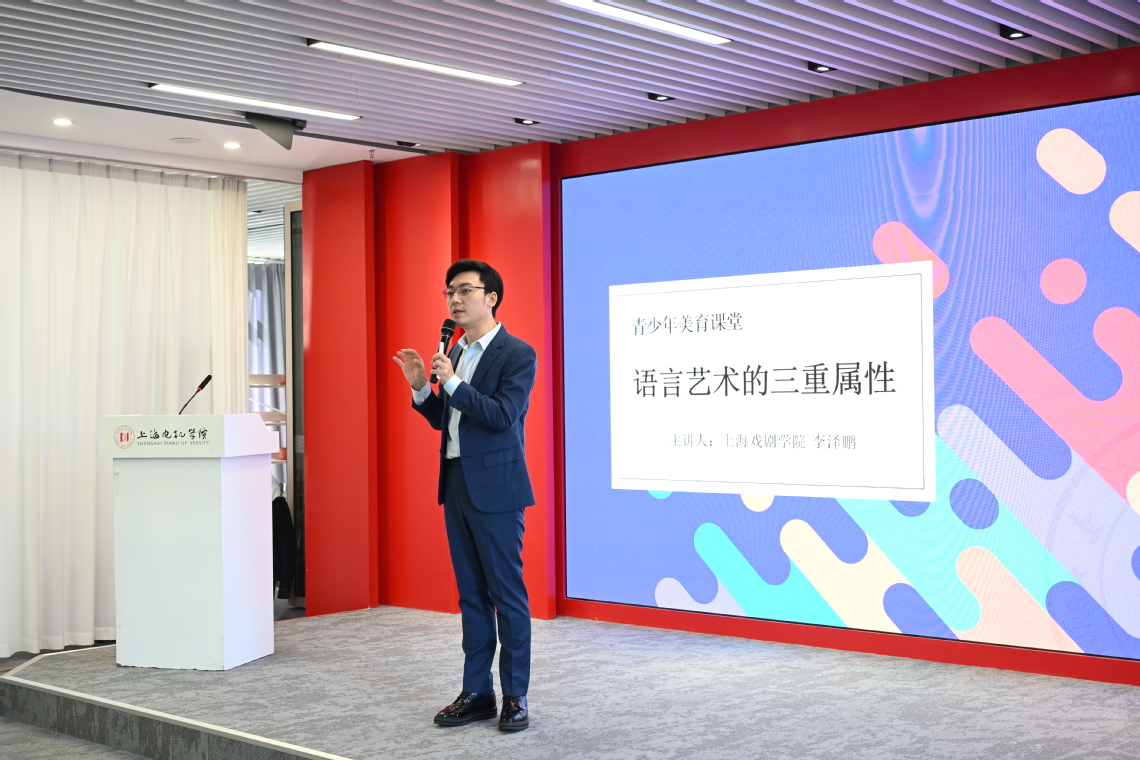 仪式尾声,原中央广播电视总台新闻主播、上海戏剧学院李泽鹏老师带来“开课第一讲”。结合自身专业经验,李老师围绕经典诵读的技巧、情感表达的要点展开分享,用“文字要落地” 的生动理念,指导学子如何让听众透过声音感受到文本细节,为社团成员带来首场专业培训。