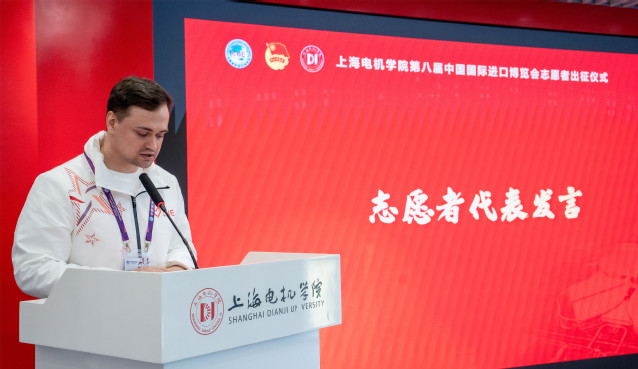 校团委书记钱斌在介绍本届进博会志愿者招募组成情况,特别提及周涟漪、胡骏烨、基米尔、梁爽等优秀志愿者代表,他们将分别在文创馆宣传、展务咨询、人文交流、长期管理岗上发挥专长,展现电机学子风采。