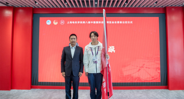 校党委副书记朱洪春为进博会志愿者服务队授旗,并从“电机人的严谨”“电机人的温度”“电机人的视野”三个维度向这一届小叶子们提出希望。他勉励志愿者们以校训为指引,将“明德”之心传递善意,以“博学”之能做好服务,用“笃行”之力践行承诺。