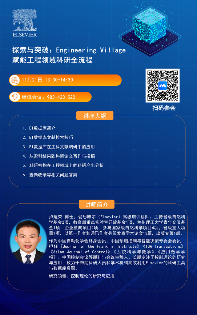 作为中国自动化学会终身会员、中国预测控制与智能决策专委会委员,担任《Journal of the Franklin Institute》《ISA Transactions》《Asian Journal of Control》《系统科学与数学》《应用数学学报》、中国控制会议等期刊与会议审稿人。长期专注于控制理论的研究与应用,致力于帮助科研人员和学术机构高效利用Elsevier的科研工具与数据库资源。