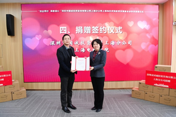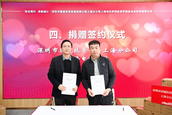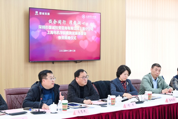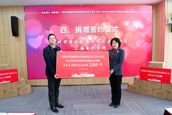 12月12日上午,临港校区产教融合楼内暖意融融。一场题为“校企同行 泽教润心”的捐赠仪式在此举行,深圳市国诚投资咨询有限公司(简称“国诚投顾”)上海分公司向我校教育发展基金会捐赠1200台米技多功能电饭煲,用以支持学校事业发展。校党委副书记、副院长李晓军,国诚投顾上海分公司总经理刘健文代表校企双方共同出席,仪式由基金会秘书长张跃辉主持。