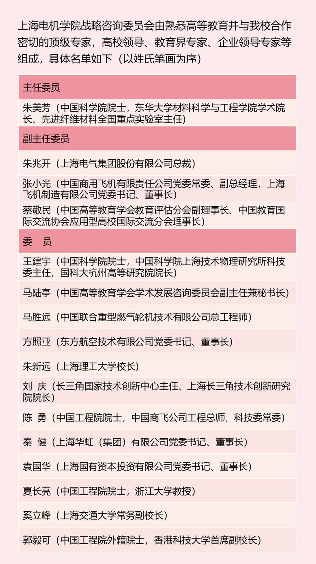 上海电机学院战略咨询委员会作为引领学校发展规划,为学校高质量发展提供决策咨询的重要平台,未来,学校将以战略咨询委员会成立为新起点,充分发挥平台聚智聚力、链接资源的核心作用,深度整合政产学研用各方优势力量,切实将战略咨询委员会的智慧转化为推动学校高质量发展的强大动能。“十五五”期间,学校将锚定建设具有航空航天特色的全国示范应用技术大学目标,紧扣国家加快高水平科技自立自强战略部署,精准对接上海“五个中心”建设需求,以“为科服务、为产育人”为导向,持续深化教育综合改革,夯实办学特色,补齐短板弱项,不断提升学校特色显示度、人才精准度和服务贡献度,在服务国家战略、赋能区域经济社会发展中作出更大的贡献。(供稿:党委组织部)