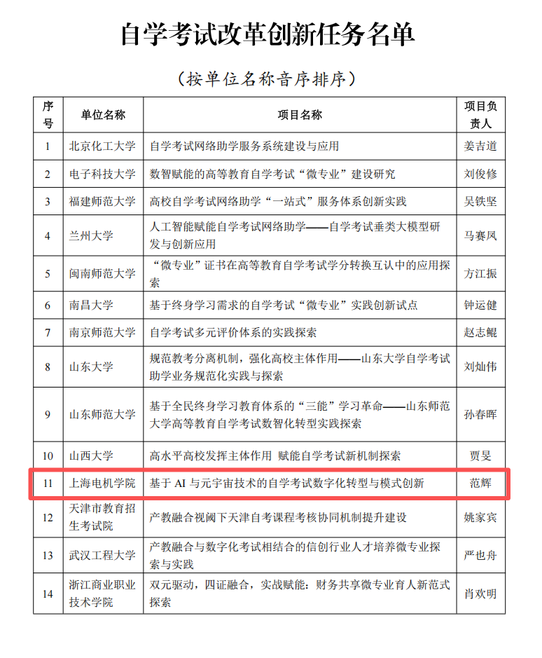 此次项目获批,是学校长期深耕高等继续教育改革、主动布局教育数字化转型的阶段性成果,彰显了学校在自学考试领域的学科积淀、技术优势与实践能力。未来,学校将以该项目为抓手,持续深化自学考试教学改革与模式创新,聚焦高素质应用型人才培养核心目标,不断完善数智化教学体系。同时,学校也积极探索“自学考试+技能认证”融合发展新模式,推动人才培养与行业需求深度对接,助力考生实现“一专多能、一考多证”,切实提升人才培养质量,并体现应用型人才的培养特色,为服务全民终身学习体系构建、赋能学习型社会建设贡献“电机方案”与“电机力量”。(供稿:继续教育学院)