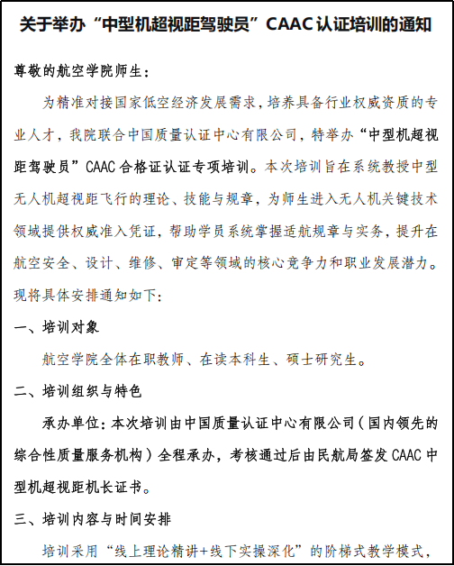 为精准契合国家低空经济发展人才需求,学院联合中国质量认证中心有限公司举办第一期“中型机超视距驾驶员”CAAC合格证认证专项培训班。培训采用“线上理论精讲+线下实操深化”的阶梯式教学模式,系统教授无人机适航法规、航线规划、飞行驾驶及调试维修等核心技能。第一期培训班共招收10名学员,其中航空学院1名实验中心教师及2名本科学生参与学习,为师生进入无人机关键技术领域提供权威准入凭证,进一步强化实验室在行业人才培养中的实践保障作用。