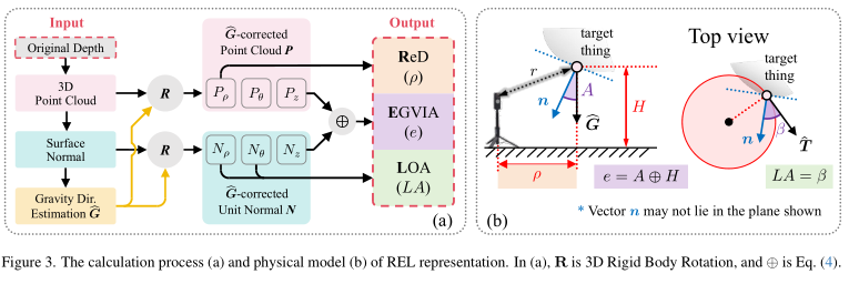 首先,基于柱坐标系提出了不依赖相机参数的REL深度表示,REL包含:表示平面距离的矫正深度(Rectified Depth, ReD)、融合了高度信息与表面法向量与重力方向的夹角的高程增益垂直倾角(Elevation-Gained Vertical Inclination Angle, EGVIA)以及建模表面法向量与圆柱切线之间的夹角的侧面取向角(Lateral Orientation Angle, LOA)。