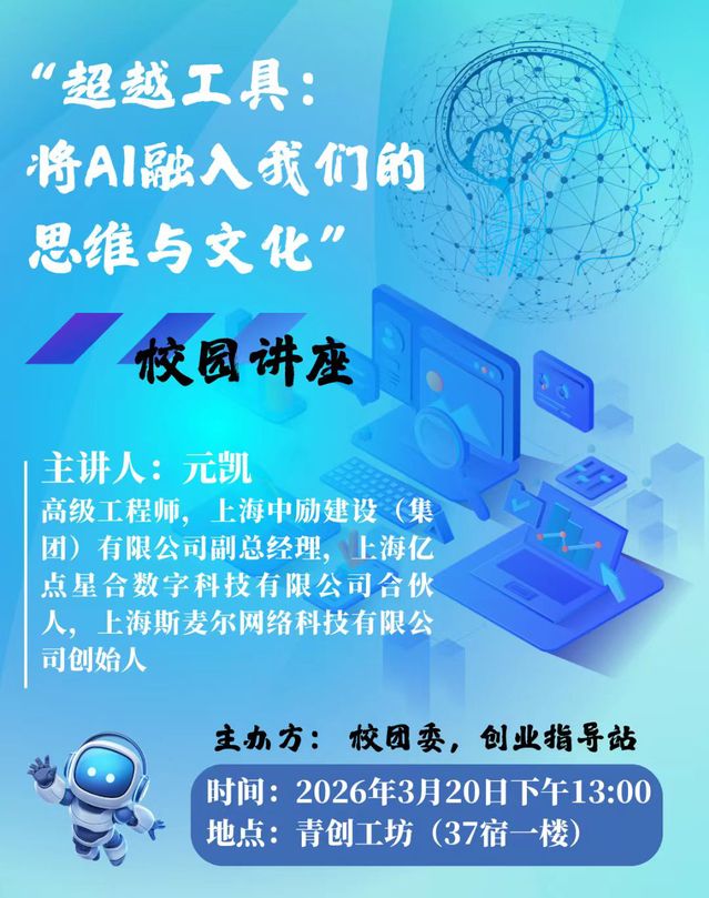 本次讲座以“超越工具:AI赋能思维与文化”为主题,面向学生讲解AI的核心能力与短板,明确人类在与AI协作中“定义问题、宏观决策”的核心价值;结合行业实践案例,解析AI对脑力劳动、职业角色的重构,及AI赋能个人成长的路径;同时分享AI时代的核心能力要求,引导学生树立跨学科思维,学会借助AI提升学习与思考效率。