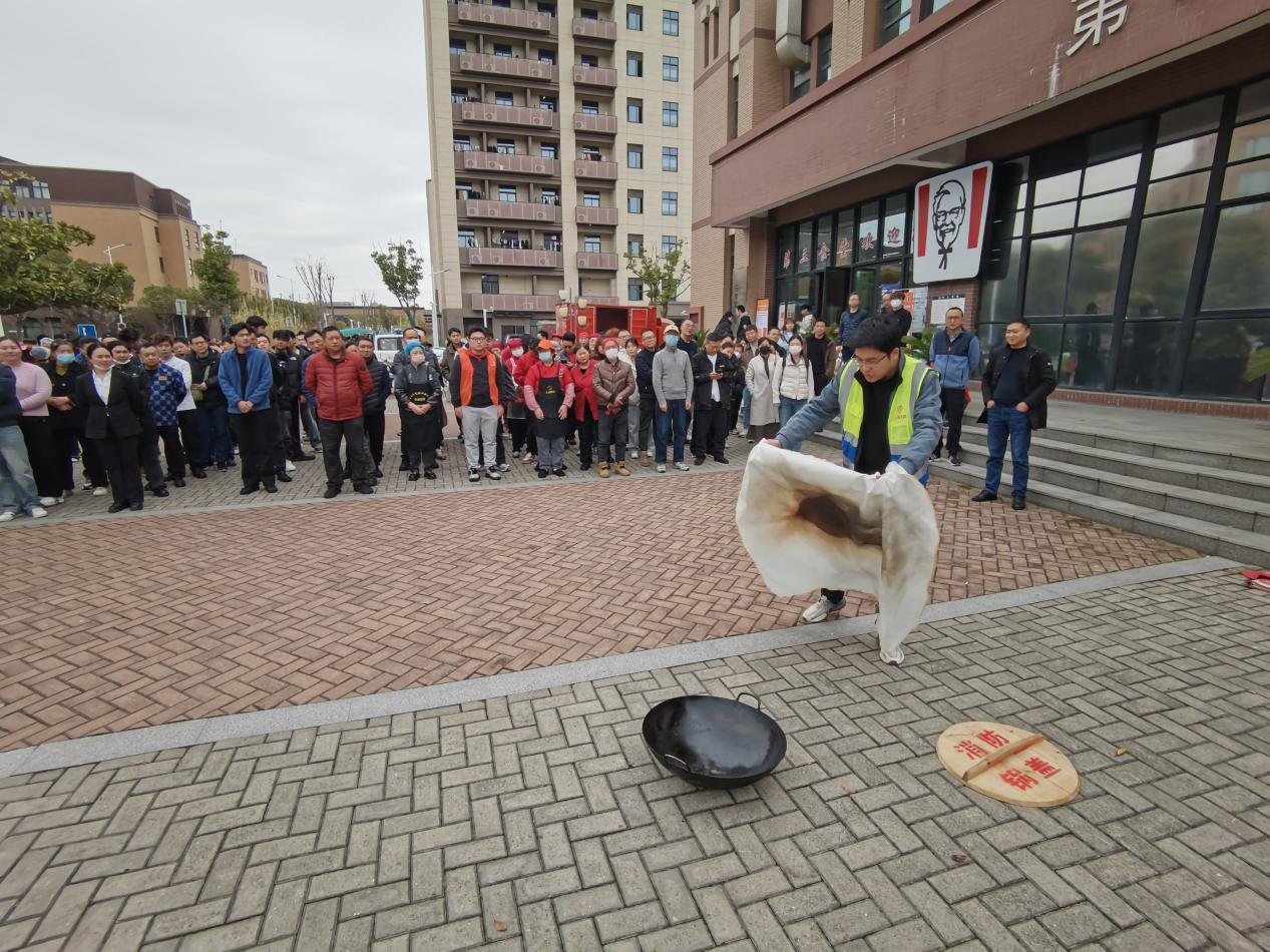 3月23日下午,闵行校区美食一条街小广场率先拉开了本轮演练的序幕。此次演练由保卫处与总务部联合组织,旨在强化食堂、商铺全体员工的消防安全意识与实战技能。食堂管理人员、厨师、工段长、特色窗口负责人、各商铺人员及学校新进人员参与了演练。